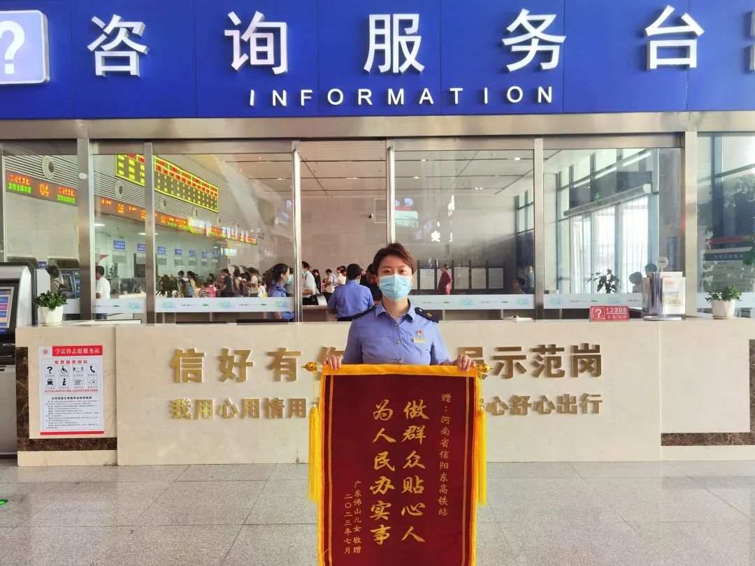信阳东站累计帮助重点旅客2000余人次,帮助旅客寻回遗失物品900余件,先后收到旅客锦旗18面,各类表扬信33封、表扬电话200余通,赢得了广大旅客的好评和赞誉。