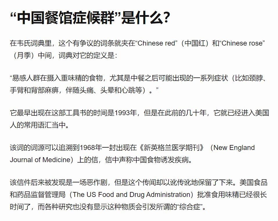 然而,味精的负面声誉始于20世纪60年代。当时,一位美国教授在享用中餐后,感到不适,出现头痛、四肢麻木、意识模糊、恶心等症状。他认为这可能是味精所致,并将此现象命名为“中餐馆综合症”。此后,中餐及其使用的味精被贴上了不健康的标签,导致许多中餐馆为了维护生意,不得不声明菜品中不含味精。不过也有一种说法是中餐在美国当时大受欢迎,于是,西餐/快餐馆用散布谣言来打击中餐馆的生意。总之,这是一场彻头彻尾的“恶作剧”至于味精是否真的引发这些症状,目前尚难以确定,因为很难找到直接的证据。人们在用餐时不仅仅摄入味精,还有其他成分。因此,即使出现某些症状,也无法断定是味精所致。尽管进行了众多研究,但迄今为止,科学界并未找到确凿证据证明味精导致健康问题。尽管缺乏证据,仍有部分人认为自己对味精有不良反应。