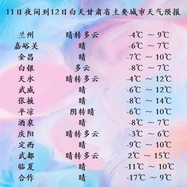 明天夜间到后天白天(12月12日20时-12月13日20时),陇南、天水、平凉三市晴转多云,部分地方阴有小雨(雪)或雨夹雪;省内其余地方晴或多云。