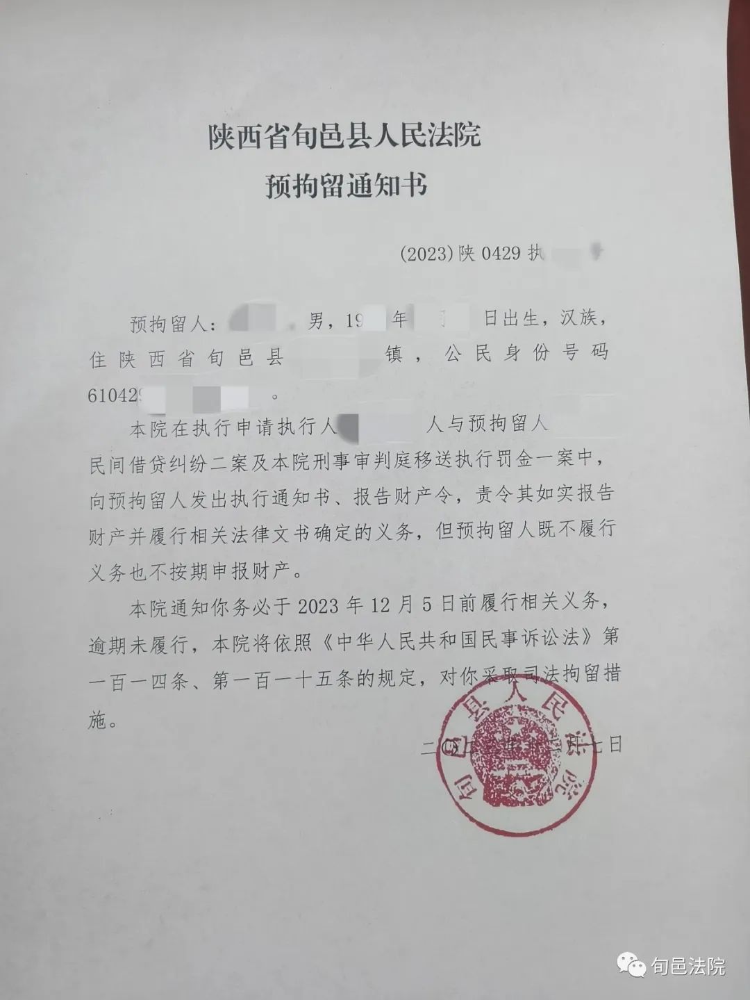 原标题:《旬邑法院发出《预拘留通知书》顺利执结3起小标的执行案件》