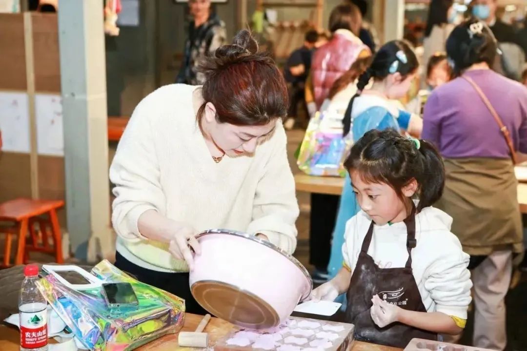 本次“家庭日”活动分别有定胜糕制作体验、团扇体验、陶艺体验、皮具艺术体验、小小中医师体验,参加活动的家庭在专业老师的指导下,家庭成员们互相协作,共同完成了一件件精美的作品。活动现场气氛热烈,欢声笑语不断,家长和孩子们在制作过程中不仅学到了手艺技巧,还增进了彼此之间的情感交流。