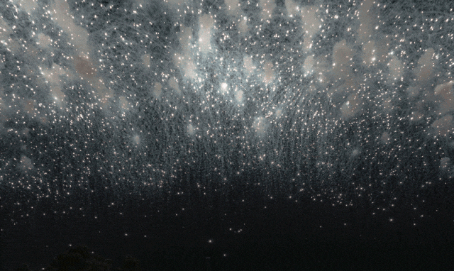 关于白日烟花与夜晚的差异,蔡国强曾说,夜景烟花以光实现效果,绚烂绽放又归于暗黑;白天烟花以烟为形,虽然也能有诗意,但它是在现实的社会和自然里叠加上作品。两种烟花是有着美学上的不同。这次是用满天繁星闪烁的礼花照亮海天,点亮白天烟花。在蔡国强看来,“白天烟花与绘画更近,也受自然、环境影响更大。”眼前,他标志性的五彩泼墨式礼花目不暇接地在空中爆裂、绽放,伴随着亮晶晶闪烁着的星星点点,仿佛召唤出一片遥远时空的宇宙星云。
