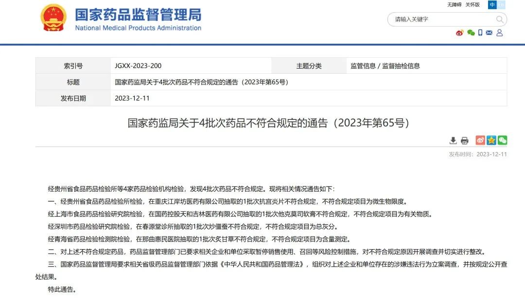内容如下经贵州省食品药品检验所等4家药品检验机构检验,发现4批次药品不符合规定。现将相关情况通告如下: