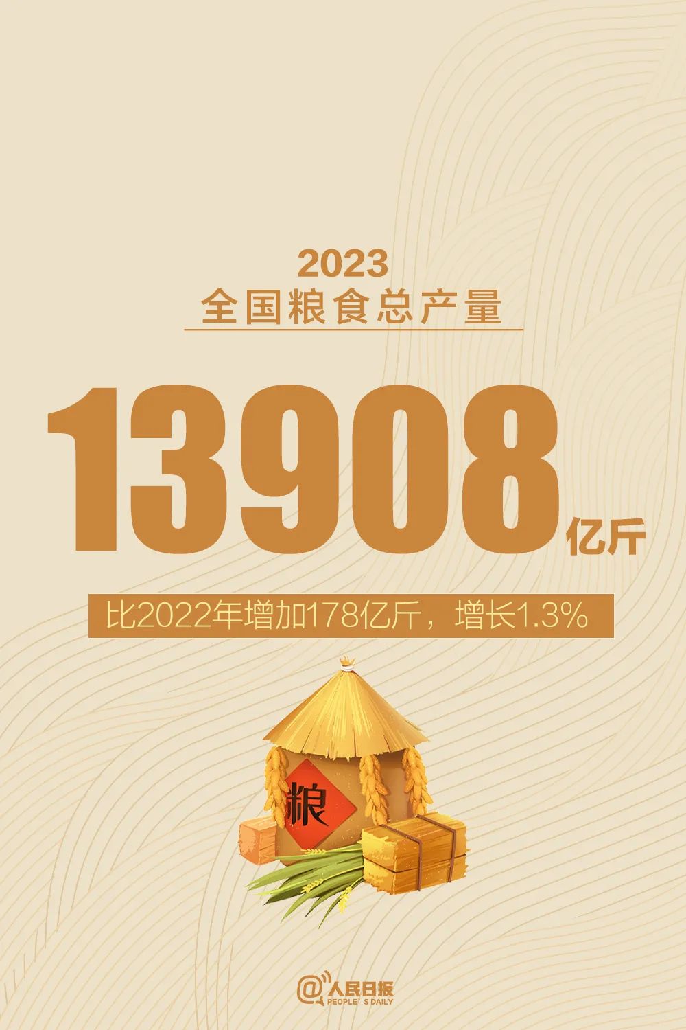 国家统计局12月11日发布的数据显示,2023年全国粮食生产再获丰收,全年粮食产量再创历史新高。2023年全国粮食总产量13908.2亿斤,比上年增加177.6亿斤,增长1.3%,连续9年稳定在1.3万亿斤以上。