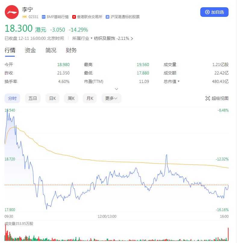 12月10日晚间,李宁(02331.HK)披露公告拟斥资22.08亿港元在香港买楼, 12月11日港股开盘,李宁股价低开低走。截至当日收盘,李宁股价跌14.29%,报收18.3港元/股,最新市值约480亿港元。
