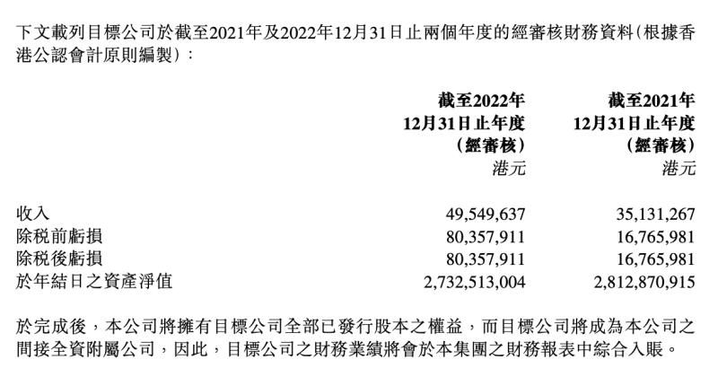 据公告介绍,目标公司2022年收入为4954.96万港元,2021年收入为3513.13万港元。各物业租户均为独立第三方,公司拟于完成后与物业现有租户商讨续约事宜或为尚未租赁的物业空间物色新租户。