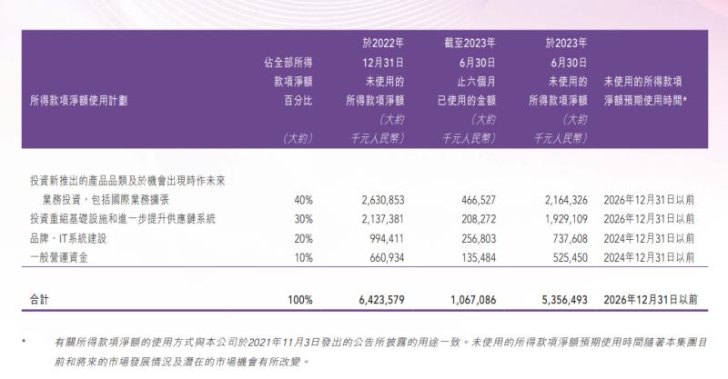 未来也不乏资金的押注,2023年中报显示,李宁集团计划使用所得款净额占比约40%的投资,作为新推出的产品品类以及最终机会出现时作未来业务投资,其中就包括国际业务扩张。