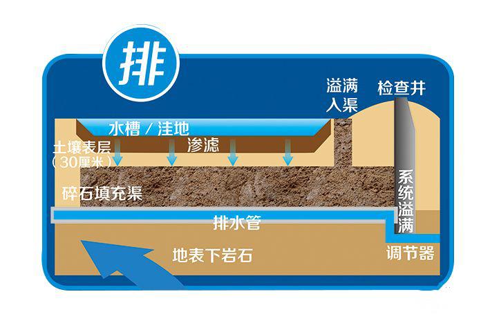“滞”,主要作用是延缓短时间内形成的雨水径流量。比如说,通过微地形调节,让雨水慢慢地汇集到一个地方。