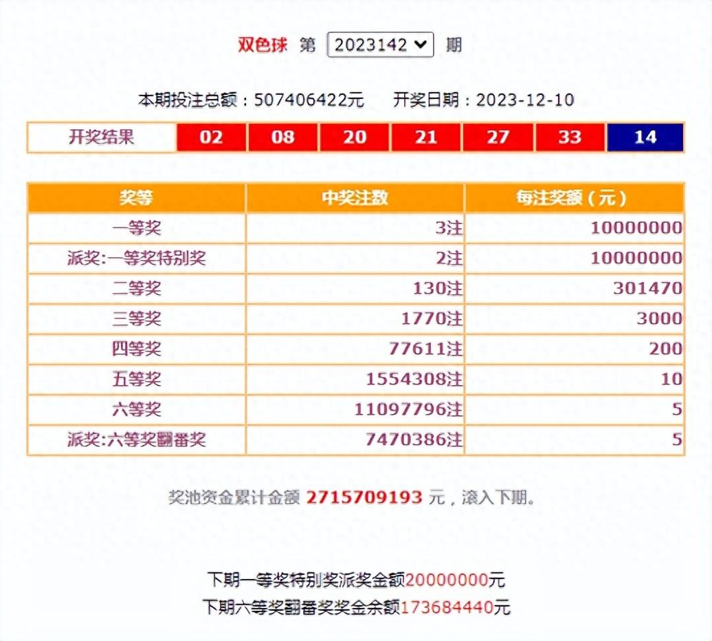 12月10日晚,中国福利彩票双色球游戏第2023142期开奖,红球号码为02、08、20、21、27、33,蓝球号码为14。