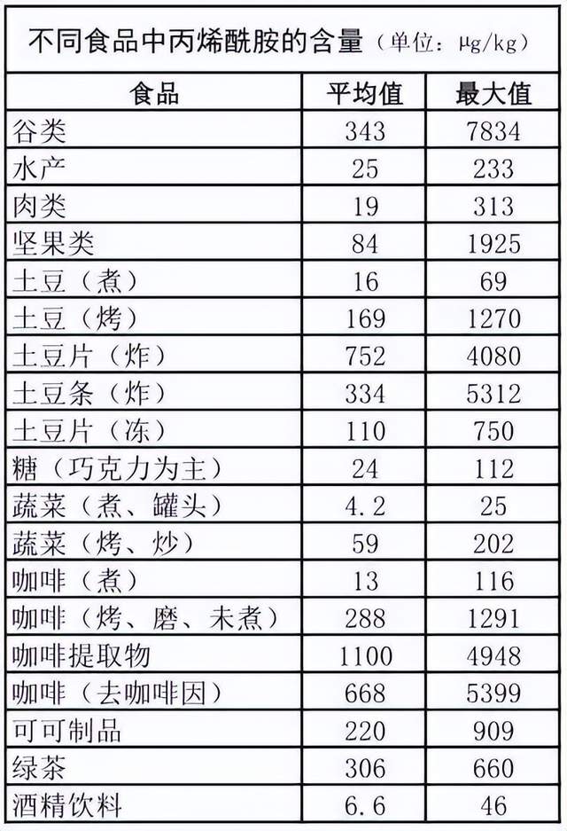 2005年联合国粮农组织/世界卫生组织联合设立的专家委员会(JECFA),将来自24个国家的6752个检测数据,按照食物类别统计出丙烯酰胺的含量如下表显示。