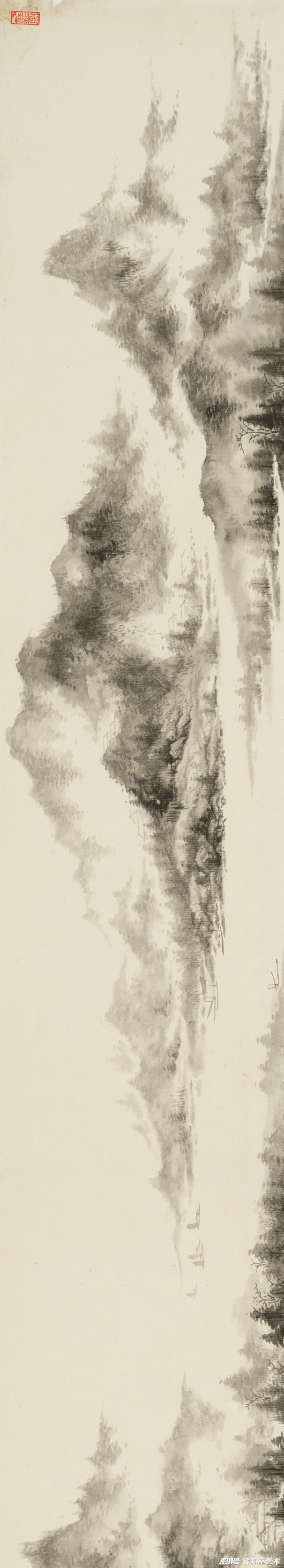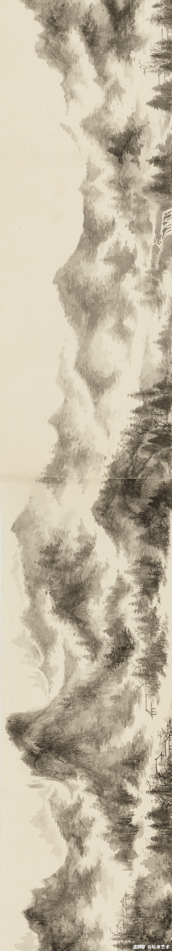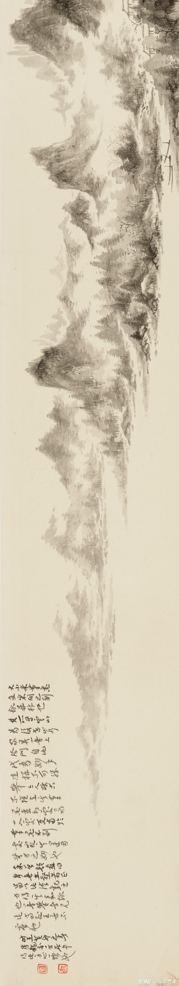 题款:大小米笔墨,两宋间之别趣异材也。其所写云山,为后世山水家开一无上法门。自此代有妙手佳构,不可胜举。今人师古,不惟在其笔墨变幻处寻一入处,更当于笔墨不到处,窥其运用无方之妙也。余曾题画曰“胸无丘壑”者,正当以此法观之,方得其嘉趣也。善鉴者见此,当知吾言不虚也。