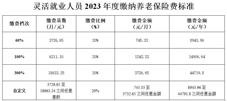 省人社厅公布了2022年河北省城镇单位全口径统计社会平均工资74533元,根据有关规定,2023年灵活就业养老保险以2022年河北省全口径统计社平工资60%至300%确定缴费基数,以20%的缴费比例缴纳当年的灵活就业养老保险费(其中12%记入统筹基金,8%记入个人账户)。
