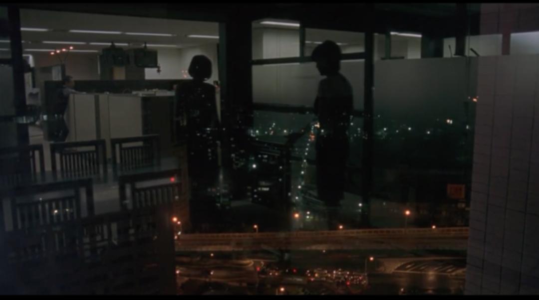 杨德昌的镜头不介入、也不强调,他只是台北和城市的肖像画师。而真实的肖像需要距离、远观、比对与观察的空间设置,因此所有的镜头都有一个前景或是遮挡,隔岸观火,隔窗见人。阿弟和旧情人在咖啡厅再次见面,镜头机位却架在玻璃窗外,反射的光影与咖啡厅的标识遮挡了二人的表情神态,仅有一对较为亲密的身影若影若现。这是影片人物第一次在私人场域下有较为亲密的身体接触,但人物的贴近与观众之前却仍然存在着玻璃的隔阂。更加显著的表征是敏敏在公司和同事诉苦。悬在玻璃窗外的镜头,只能留下整个城市的霓虹倒影。这种微妙的阻隔,让我们共感城市空间中的庞大与拥挤、隔绝与陌生。密密匝匝的高楼中每一个格子都有它的悲欢离合,只是不足向外人道也。
