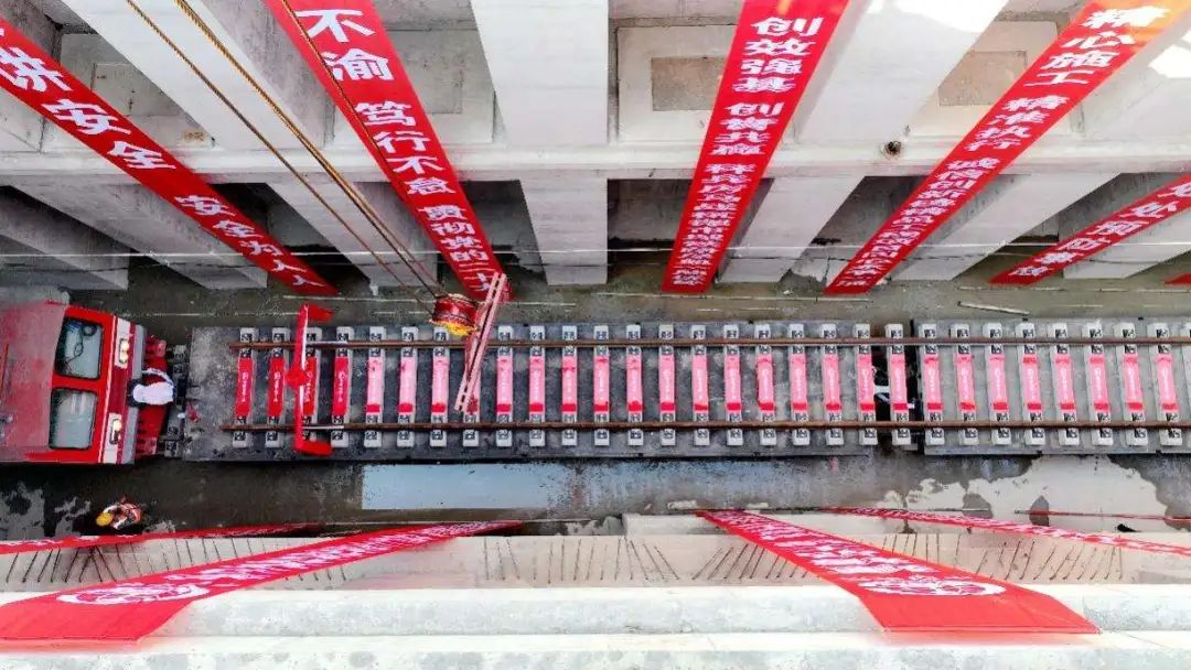 11月28日,杭德市域铁路轨道工程施工现场,随着一声令下,两台龙门吊将首节25米轨排平稳地吊运至右线铺设位置,标志着杭德市域铁路轨道工程全线开铺。