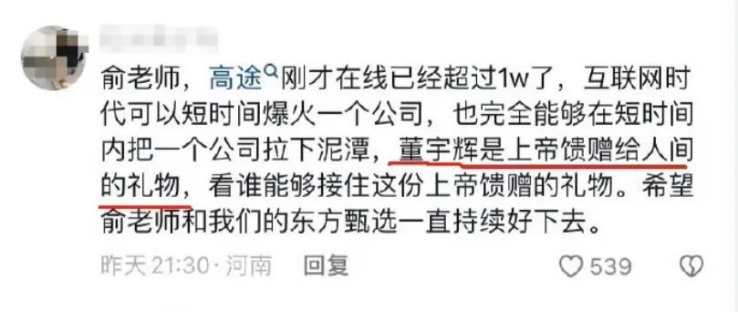 公司高层也向来不吝对董宇辉的夸赞,俞敏洪便曾多次在公开场合肯定董宇辉的贡献。