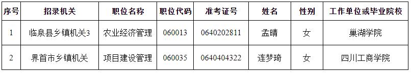 根据《安徽省2023年乡镇机关公务员专项招考工作实施方案》等规定,报考临泉县等乡镇机关的孟晴等2名考生,经报名、笔试、面试、体检、考察等程序,符合本次考试录用条件,拟予以录用。现将拟录用人员名单向社会公示5个工作日(具体名单附后),公示时间从2023年12月13日至12月19日。公示期间如有问题,请及时与市公务员主管部门、监察部门联系。