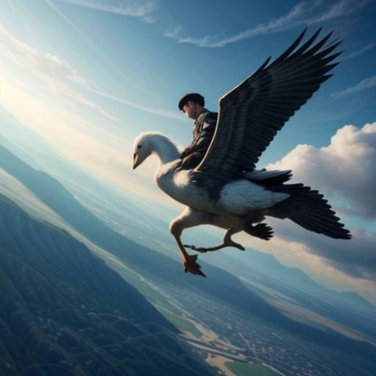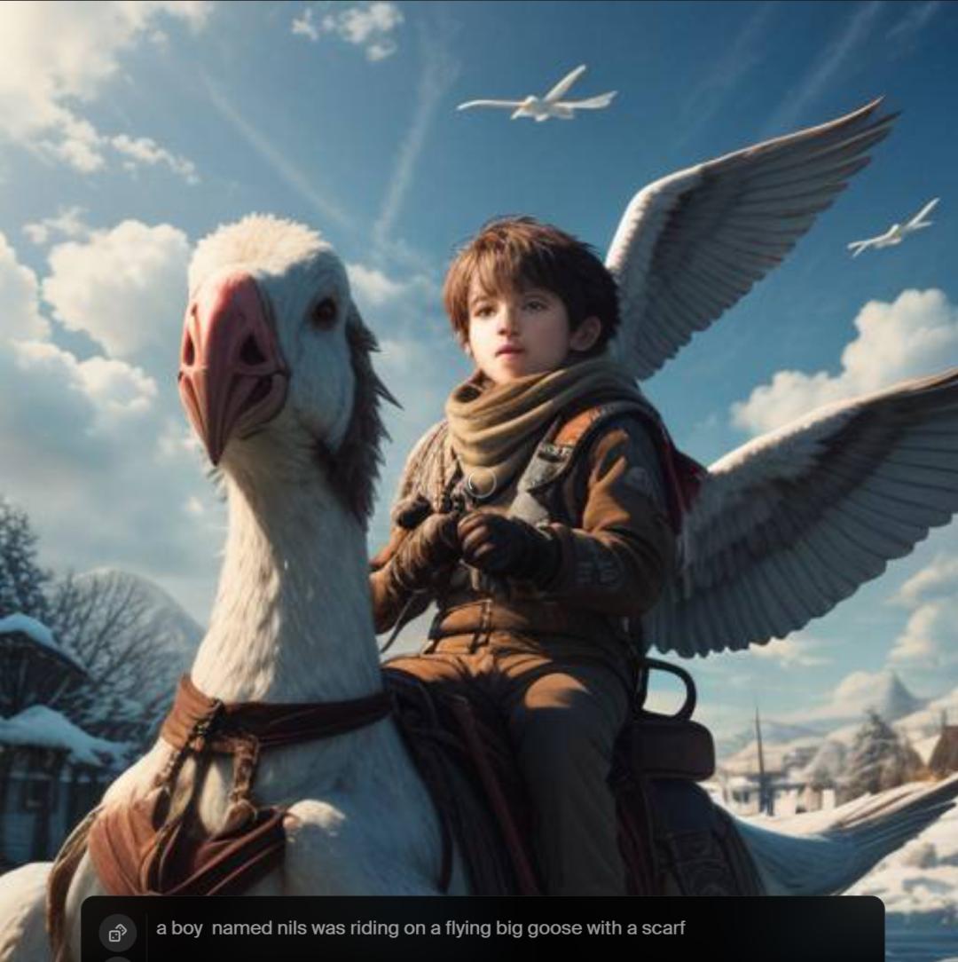 输完 「一个叫尼尔斯的男孩儿,骑着一只飞翔的大鹅」时,画面变成了这样: