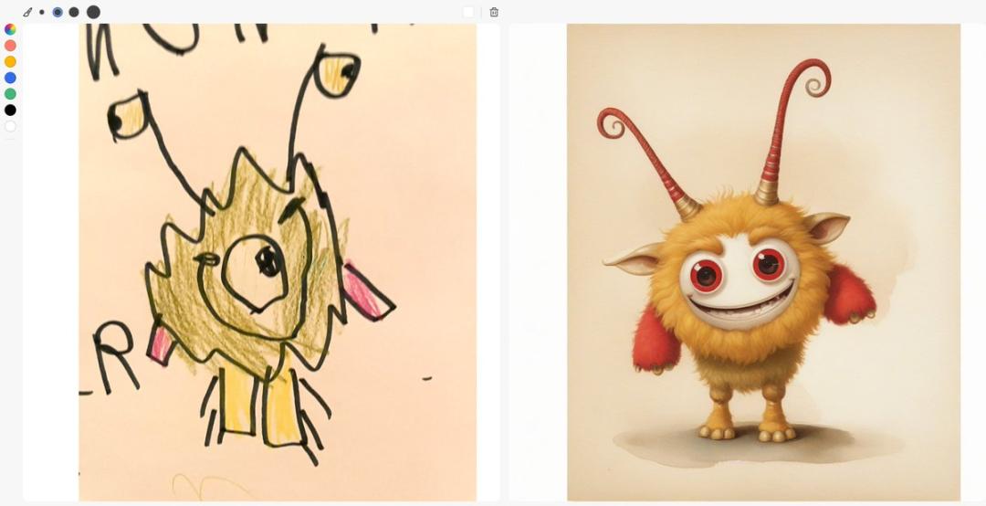 一位网友仅用四分钟,就将自己孩子一样的涂鸦变成了一幅逼真的 AI 肖像:来自 x平台网友 titus