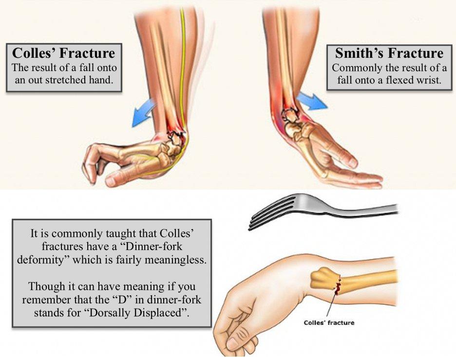 大家都知道,我们摔倒下意识反应就是手撑地。如果是年纪比较大的老人,本身就有一些骨质疏松,摔的时候身体协调能力又不是很好,这个时候他手着地往下一戳,如果是往后手背先着地,叫 Smith 骨折;手心着地就容易出现 Colles 骨折,出现餐叉样畸形。如果骨折复位后感觉比较稳定,打石膏固定一段时间就可以,个别情况可能还需要手术复位。