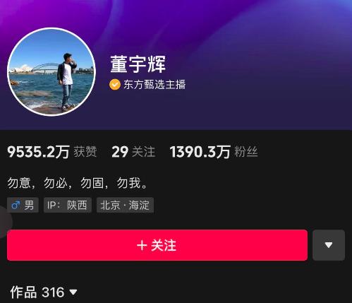 目前,董宇辉已将自己的抖音介绍从“曾经是老师,现在是售货员”改成“勿意,勿必,勿固,勿我”,且IP显示为陕西,值得注意的是,董宇辉是陕西人。