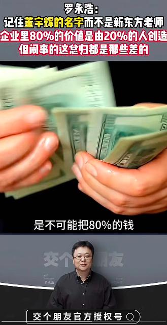 罗永浩曾在直播时称:“一个企业里真正创造80%价值的是那20%的员工,但是从收益分配来看是不可能把80%的钱分给20%最优秀的员工的。而闹事的往往是那80%的低贡献员工。”