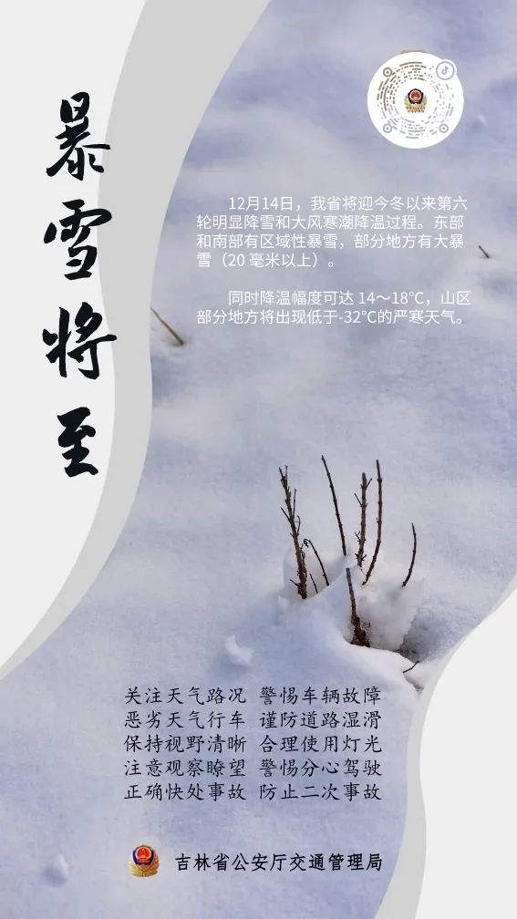 省公安厅交通管理局提示广大交通参与者:降雪天气出行,请您尽量选择乘坐公共交通工具。冬季驾车出行要提前了解交通路况、天气情况,合理规划行车路线和出行时间。