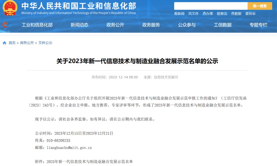 工信部关于2023年新一代信息技术与制造业融合发展示范名单的公示