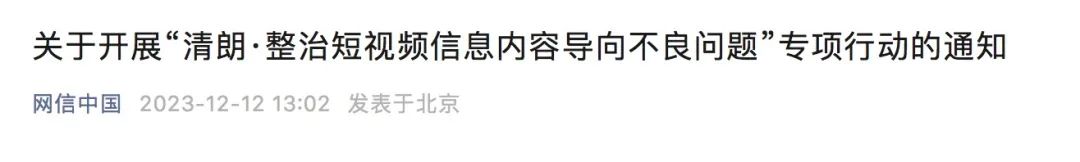 12月12日,据“网信中国”微信公号消息,中央网信办发布关于开展“清朗·整治短视频信息内容导向不良问题”专项行动的通知。