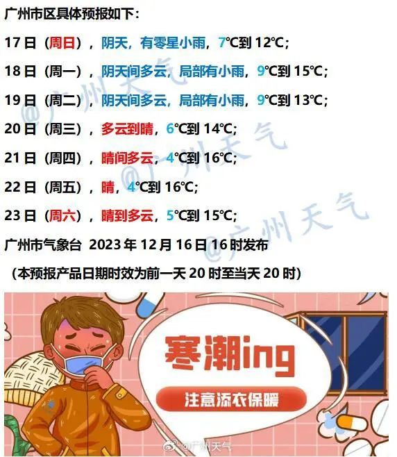 16日,大部分市县阴天有分散小雨局部中雨,6~8级阵风,高寒山区有雾和冰冻;气温继续下降。最低气温:粤北和珠江三角洲北部市县3~7℃,高寒山区零下2℃~1℃,南部市县12~16℃,其余市县8~11℃。