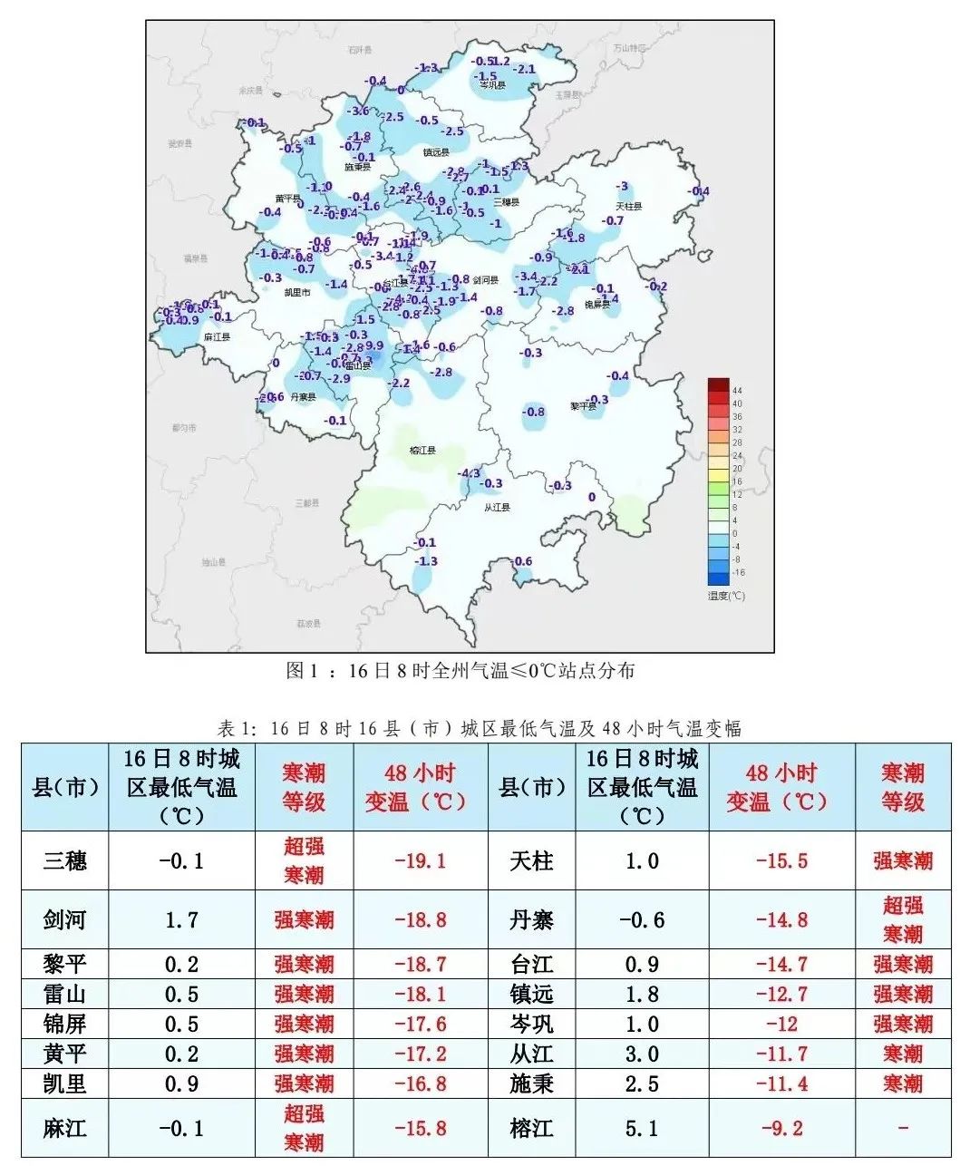 据气象监测,受强冷空气影响,16日8时16县(市)城区最低气温降至-0.6℃(丹寨)~5.1℃(榕江),凯里0.9℃,全州共有119站气温降至零下(见图1),雷山雷公山-9.9℃全州最低,乡镇台江方召-4.8℃最低。