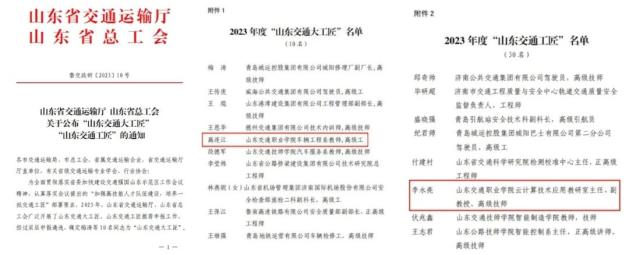 近日,山东省交通运输厅、山东省总工会公布了2023年“山东交通大工匠”和“山东交通工匠”名单。山东交通职业学院车辆工程系教师高连江获评“山东交通大工匠”称号,管理与信息系教师李永亮获评“山东交通工匠”称号。