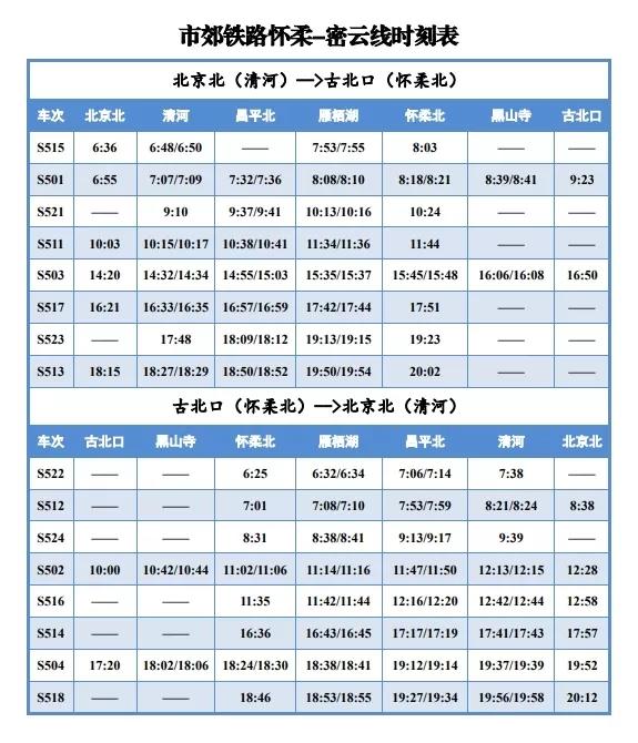 怀柔——密云线是一条服务通勤兼顾旅游的线路,早晚高峰开行2对往返怀柔北站与中心城的列车,其中从昌平北站到北京北站仅需39分钟;上午时段,开行4列由中心城前往怀柔、密云的列车;下午时段,开行3列由怀柔、密云进入中心城的列车。