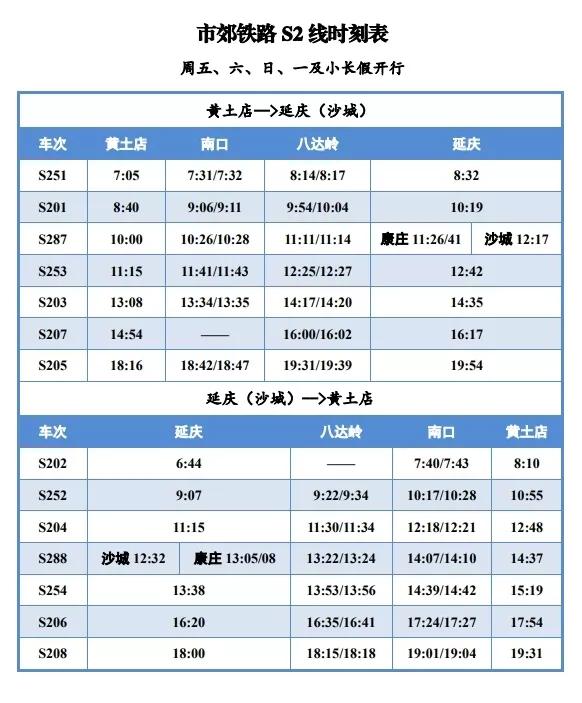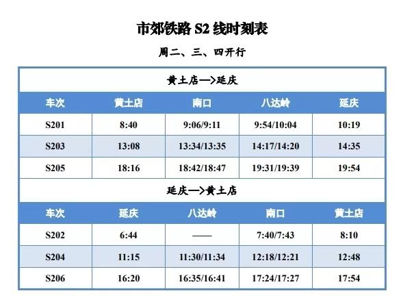 S2线是一条服务通勤兼顾旅游的线路,早晚高峰开行1对往返延庆站与黄土店站的列车,周五至周一及小长假期间平峰时段开行6对往返延庆站(八达岭站)与黄土店站的列车,其中1对往返黄土店站与沙城站。