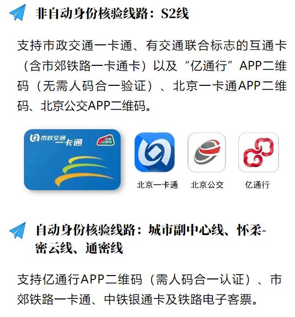 关于票卡种类,北京市郊铁路不同线路可使用的票卡略有差异,其中,城市副中心线、怀柔——密云线和通密线为自动身份核验线路,若您使用亿通行APP二维码乘车,需提前进行“人码合一”后方可使用。