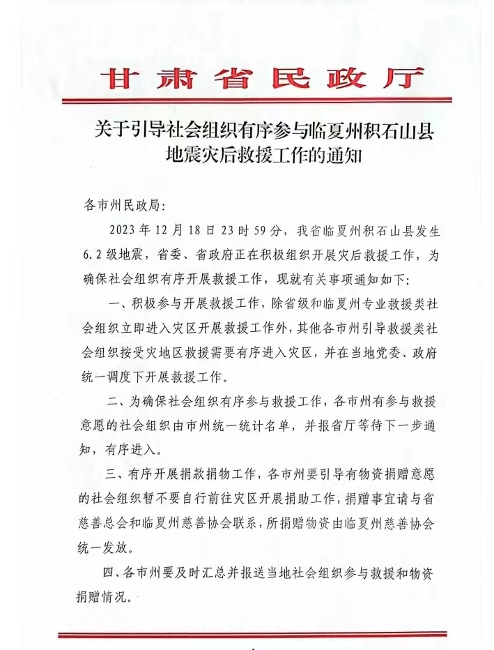 此外,上述工作人员向大河财立方记者提供了甘肃省民政厅发布的《关于引导社会组织有序参与临夏州积石山县地震灾后救援工作的通知》(以下简称《通知》),当中提到:“各市州要引导有物资捐赠意愿的社会组织暂不要自行前往灾区开展捐助工作,捐赠事宜请与省慈善总会和临夏州慈善协会联系,所捐赠物资由临夏州慈善协会统一发放。”