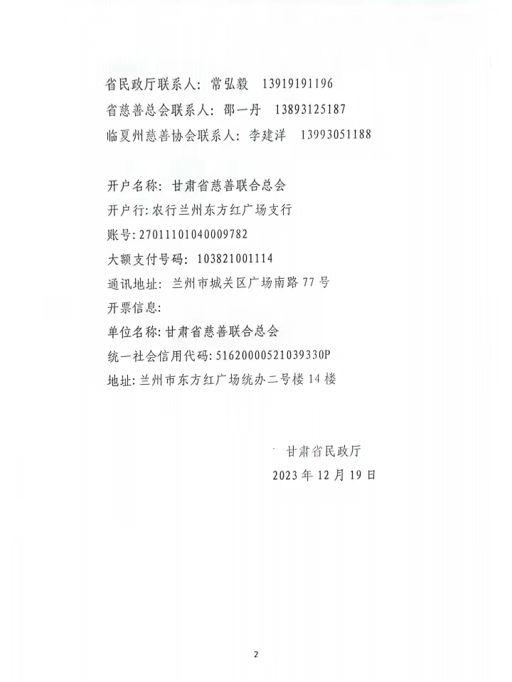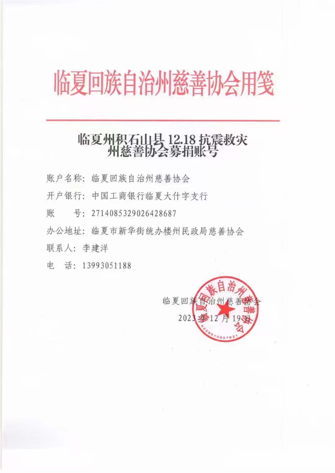 此外,《通知》还提供了负责地震灾后救援工作的具体负责人和捐赠账户,以及临夏州积石山县12.18抗震救灾州慈善协会募捐账号。