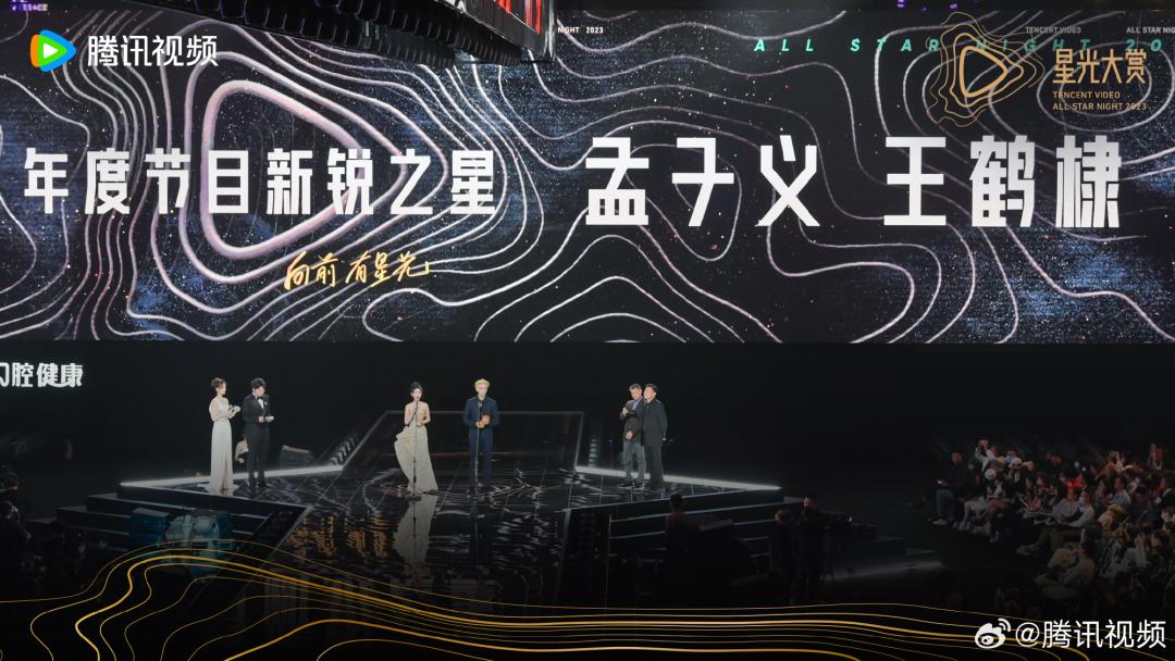 孟子义和王鹤棣上台领取属于自己的荣誉时,主持人怂恿二人PK唱歌技巧,王鹤棣开口唱的歌曲,来自于《桃花坞》另一成员汪苏泷制作的热门音乐。镜头往台下切,汪苏泷、李雪琴、徐志胜和李嘉琦坐在一起,有说有笑,表情丰富。
