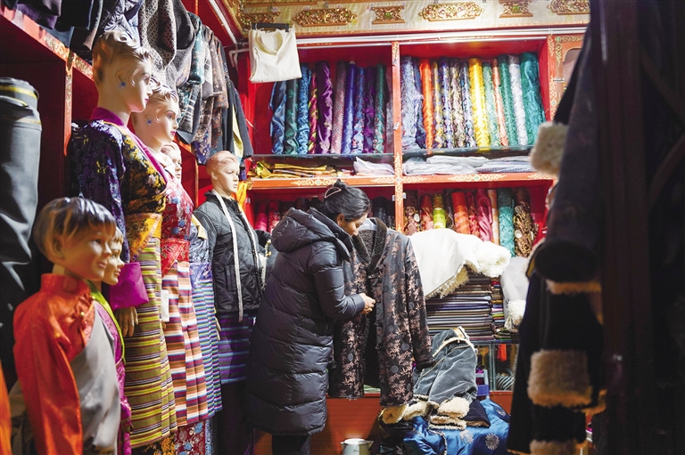 “最近来做冬款藏装的人挺多的,大部分都是本地居民。”店主吉宗介绍,中老年人常穿的款式是无袖深色和单色的“特玛”料子藏装,年轻人则喜爱传统和潮流兼备的藏装。同时,随着旅游业的发展和各民族文化交流加深,很多游客也开始购买藏装,“以前游客都是春夏买藏装,但是现在也有一些游客会买冬装。”吉宗说,大多数游客一开始普遍喜爱花色众多、颜色亮丽的绸缎料子,慢慢会比较偏向纯色、传统藏装。