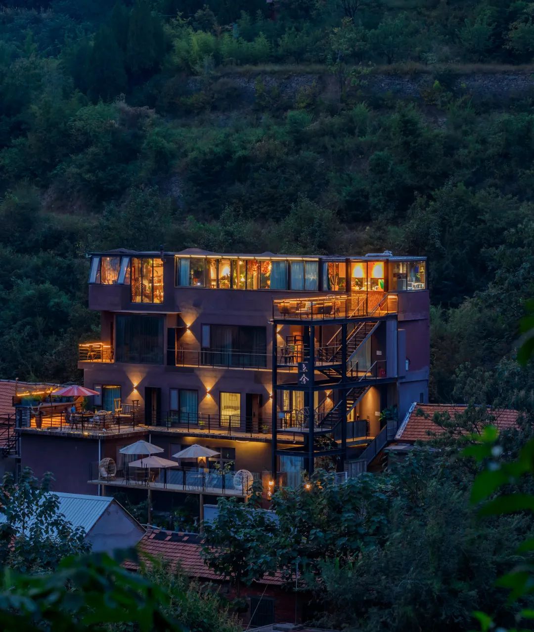 古村掩映,山间时有鸟鸣。岩石与钢架搭建起这座原生态建筑,入夜灯火通明,宛如一只四方形的金色神龛。