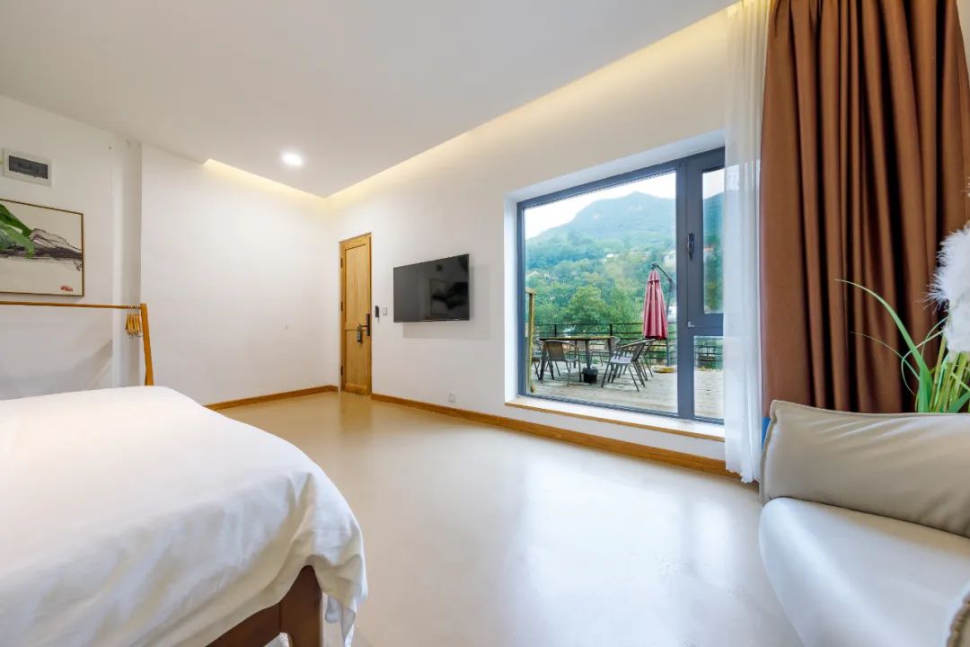 床头面向的就是山和古村,一层一层的老房屋掩映在树林间,红色的屋顶或绿或褐的枝丫形成对比,像是大山也拥有自己温暖的星星。清晨闻着鸟鸣声拉开窗帘,山上的青葱映入眼帘,瞬间抚平生活的躁郁。