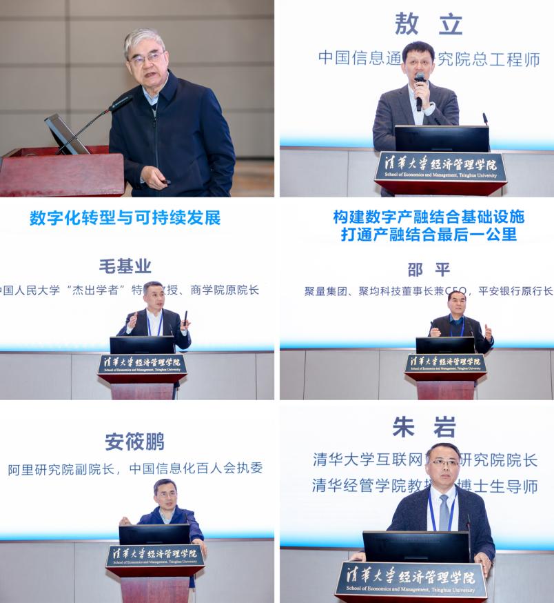 在主题演讲环节,中国工程院院士邬贺铨,中国信息通信研究院总工程师敖立,中国人民大学“杰出学者”特聘教授、商学院原院长毛基业,聚量集团、聚均科技董事长兼CEO、平安银行原行长邵平,阿里研究院副院长、中国信息化百人会执委安筱鹏分别从人工智能技术加持推动数字经济发展、新型工业化与数实融合创新发展、数字化转型与可持续发展、构建数字产融结合基础设施、拥抱云+AI定义的智能时代等视角,结合自身研究领域,发表了前瞻洞见。