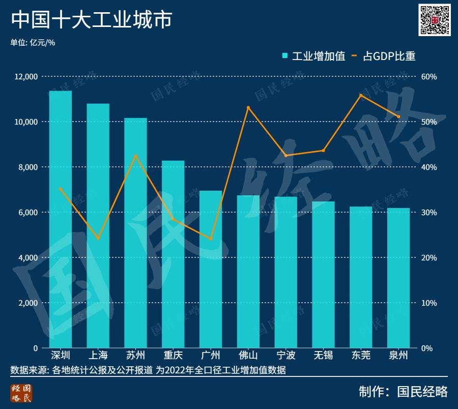 以工业增加值来看,深圳超过上海跃居全国工业第一大市,而广州、佛山、东莞分别位列第5、第6和第9。