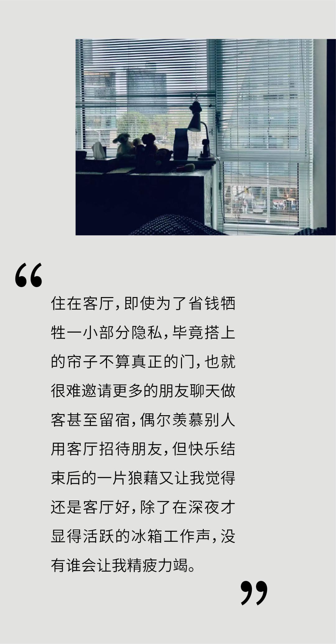 我点点头,只是附和。彼时我二十几岁,家人的供给大多花销在不见天日的设计课程所需要的源源不断的材料费上,人又一根筋不肯换方向,只有向前一条路,于是能省则省,还好,我乐于住在客厅。