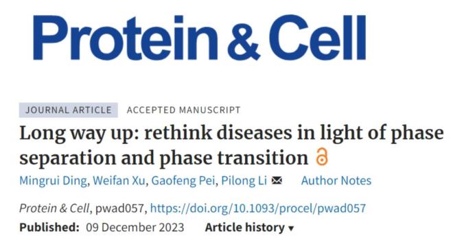 2023年12月9日,清华大学李丕龙教授团队在Protein & Cell上发表了综述文章Long way up: rethink diseases in light of phase separation and phase transition。本篇综述尝试总结领域内的工作进展,着重阐述异常相分离与神经退行性疾病、癌症和传染性疾病之间错综复杂的关联。更重要的是,文章总结了第一批“先行者”提出的基于生物分子凝聚体发展的方法论,用于开发与异常相分离相关疾病的药物以及普遍适用的技术平台。