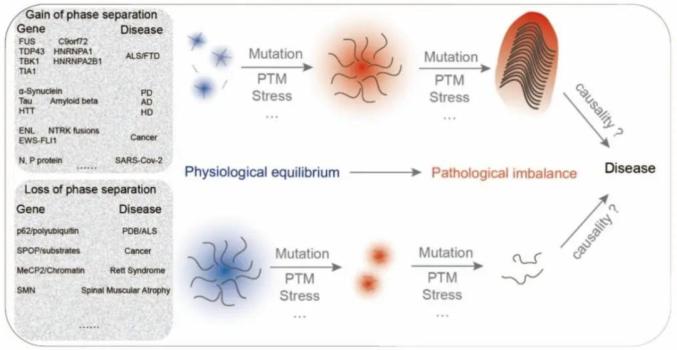 由多价相互作用驱动的生物分子凝聚体在细胞内充当了一种调控细胞基本生命活动的普遍机理。对凝聚体平衡微妙的干扰,无论是相分离的增加还是减少,都与生理功能异常或紊乱息息相关。随着基础科学广泛的拥抱这一全新的认知,我们对疾病的理解正悄然发生变革。回顾过去的十几年,在揭示异常相分离与各种疾病之间深刻相关性和潜在因果关系方面,世界范围内的科学家们取得了显著进展。
