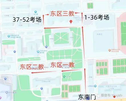 校外考生持准考证即可进入校园,请根据考场分布图及现场指引到达所在考试楼。由于东校区第三教学楼考生人数较多,因此采取分流方式安检入场,请第1-36考场的考生从三教东侧门存包、安检、入场,第37-52考场的考生从三教西侧门存包、安检、入场。