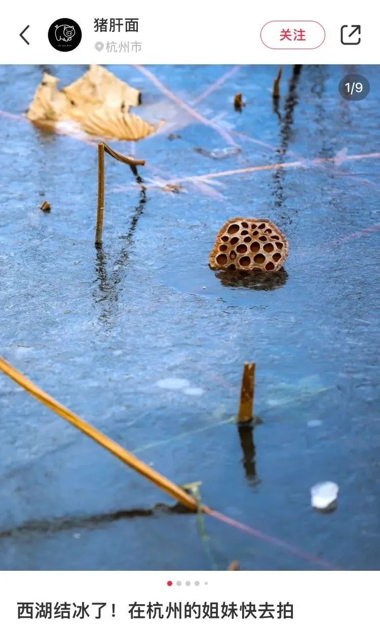 22日7时,西湖已经可以看见大片结冰,“搭配”晨曦、残荷,吸引了不少市民、游客打卡拍照 来源:小红书@猪肝面