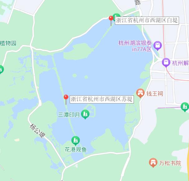 西湖按照面积大小被分为外西湖、西里湖、北里湖、小南湖及岳湖,其中外西湖面积最大。西湖白堤以北是“北里湖”,苏堤以西称为“西里湖”,这两个湖面积不大,背靠山,西风、北风的影响较小,风力较弱,湖面较为平静,气温比外西湖低1℃至2℃,冬天的岸边最容易结冰。