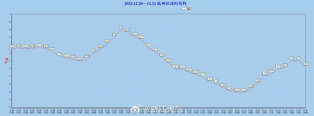 21日杭州一整天都是北风呼啸,白天的最高气温也只有1.2℃,从21日傍晚开始,杭州气温已经低于0℃,这为22日的气温创新低创造了有利的条件。
