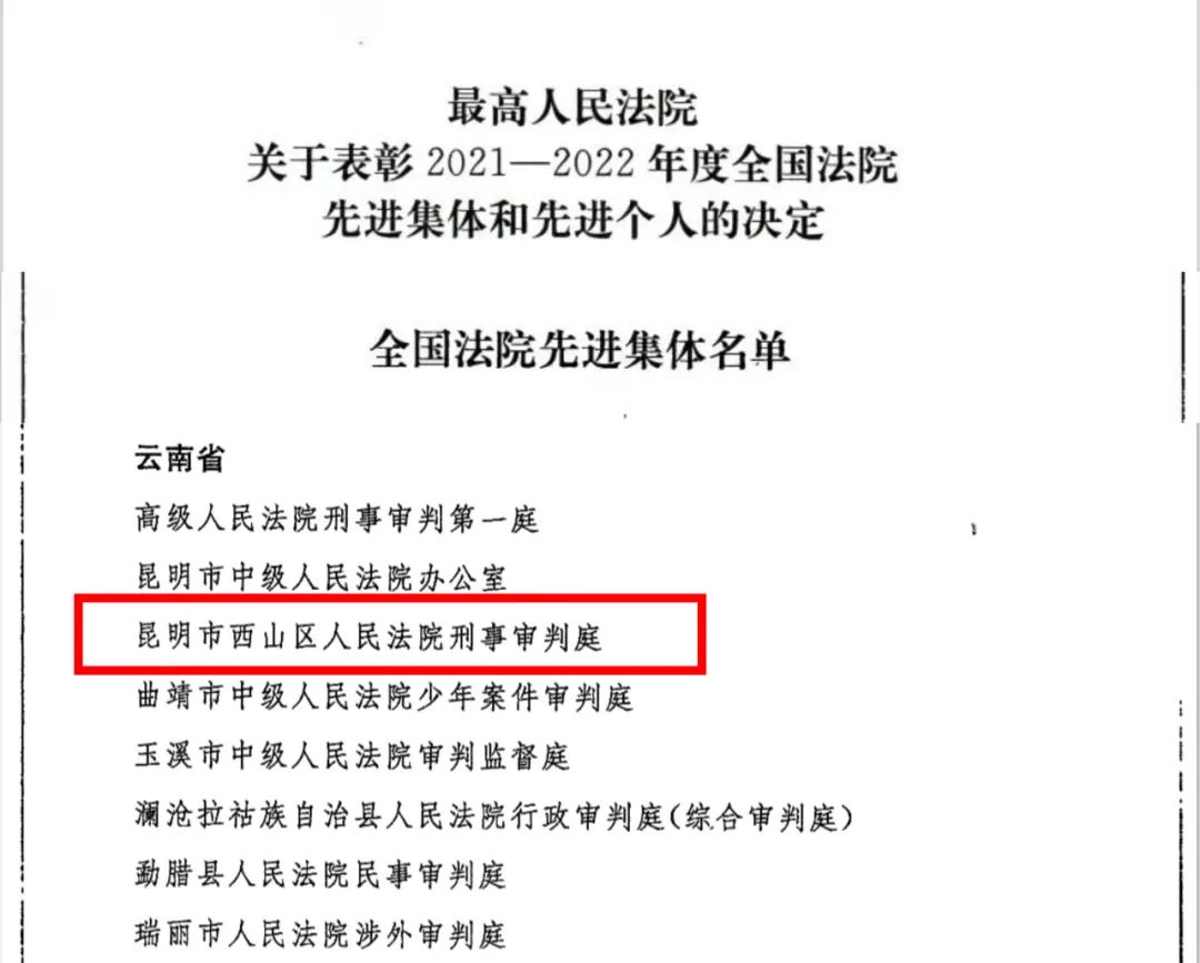 近日,最高人民法院印发《关于表彰2021-2022年度全国法院先进集体和先进个人的决定》,昆明市西山区人民法院刑事审判庭荣获“全国法院先进集体”称号。